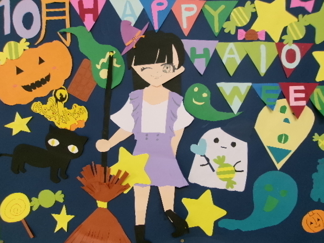 10月1日(水) 掲示委員会 10月に入りました。今日は委員会活動がありました。掲示委員会では、いつも季節に合わせた掲示物を作成しています。今月の掲示も素敵に仕上がっています。ありがとうございます。北校舎1階、渡り廊下に掲示しています。ご覧ください。Happy Halloween! |