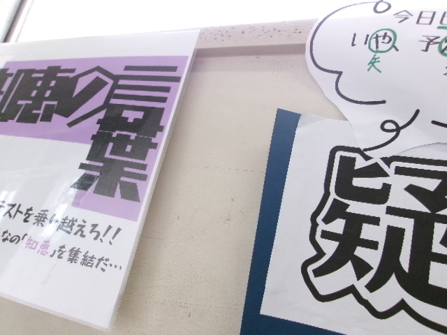 6年生 知恵の言葉 廊下を歩いていると、面白いものを見つけました。6年生のミッションは、「全員で漢字50問テストを乗り越えろ!!」です。「疑」は、「今日ヒマ?」「い矢、…」なるほど、覚えやすいようによく考えられていますね。他にも様々な漢字があり、それぞれに6年生の知恵が見られます。とても勉強になりました。 |
