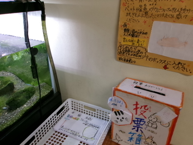 飼育委員会 1階と2階の昇降口前の廊下には、水槽があります。そこには、投票箱が置いてあります。今日から11月14日(金)までの期間で、ペットや金魚、メダカについての疑問を受け付けているそうです。質問が記入できる用紙があります。飼育委員会の取組です。 |