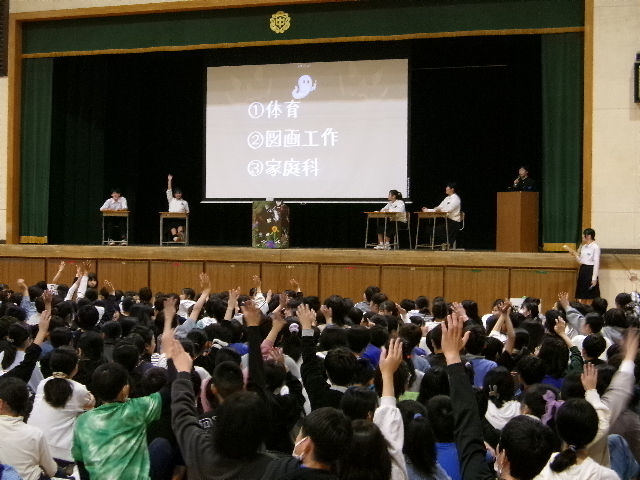 10月30日(木) 6年生 つぼみの日「常盤中学校」 全市内の6年生は、各地域の中学校に行き、授業や部活動などを見学しました。こちらは、常盤中学校です。生徒会による学校紹介では、クイズを交え、分かりやすく教えてくれました。なんと、常盤中学校の校長先生は学生服で登場しました。 |