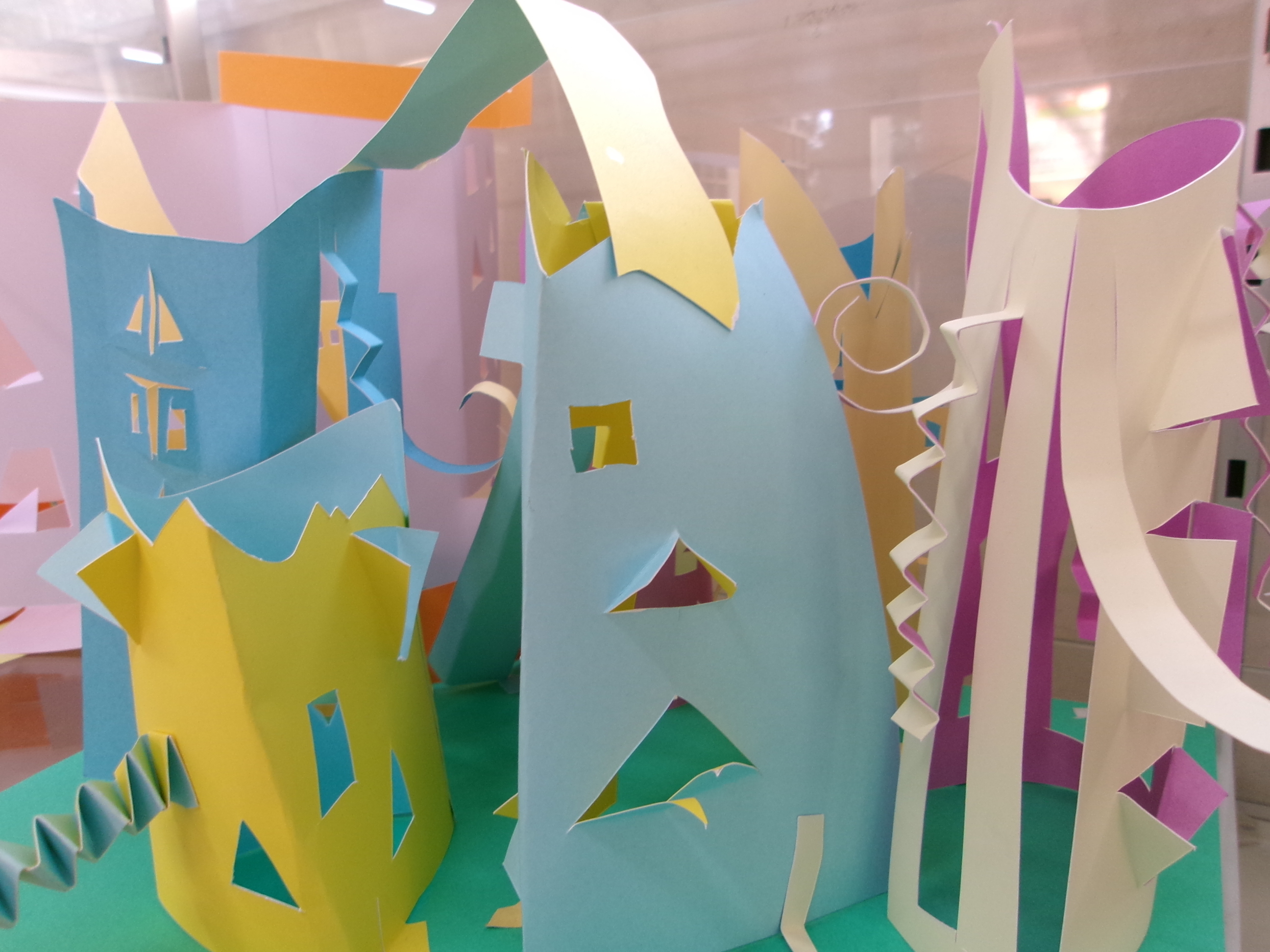 12月15日(月) 2年生 「まどのあるたてもの」 2階昇降口には、2年生が図工で取り組んだ作品が展示されています。初めてカッターナイフを使って画用紙を切り込み、穴を空けて「窓」に見立て、台紙に立てて立体感を出しました。作品をくっつけて一つの町のように見えますね。 |
