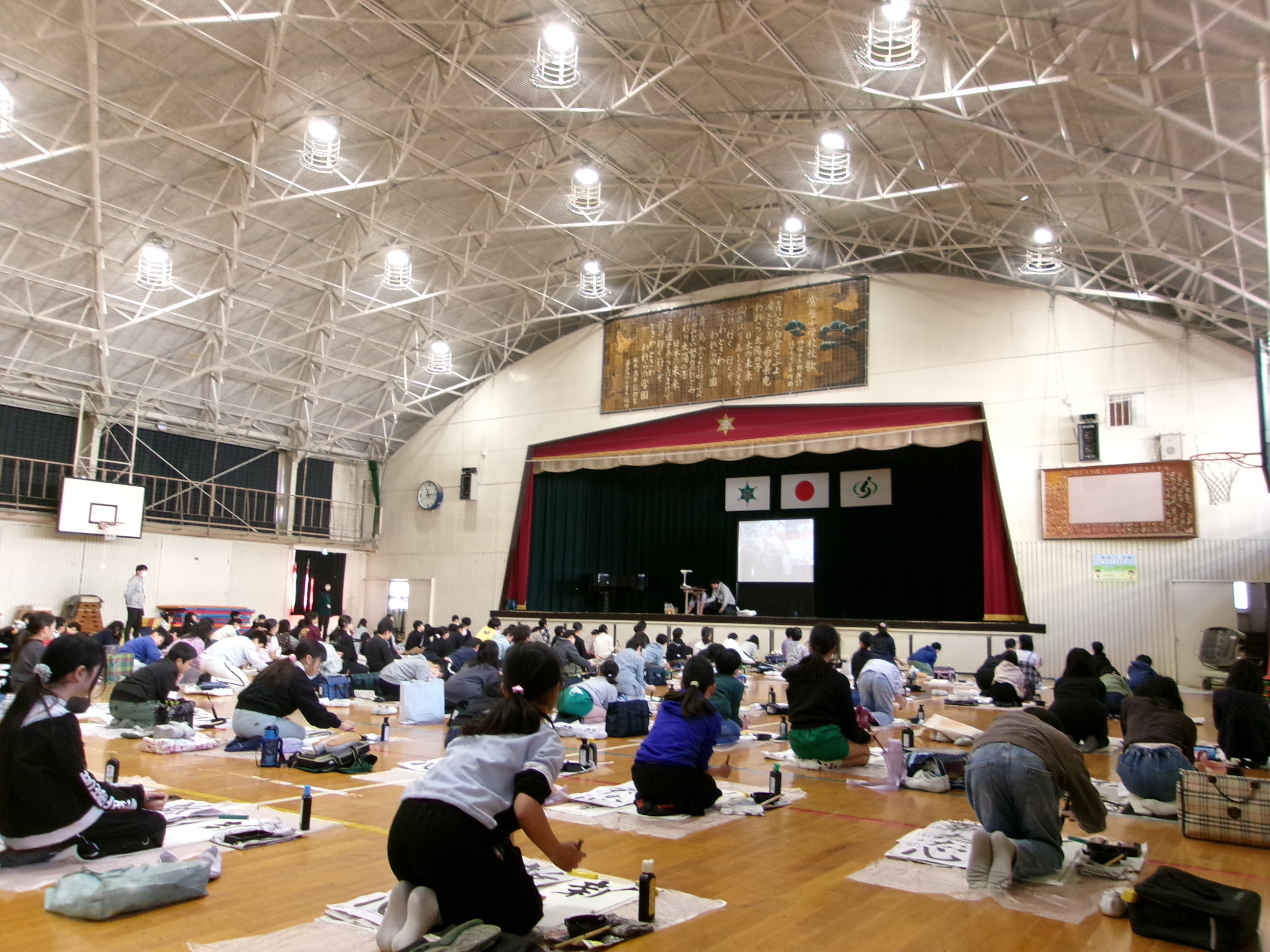 12月17日(水) 5年生 書きぞめ練習 体育館での練習が始まりました。スクリーンに映し出された書き方のポイントを見ながら先生の説明を聞き、アドバイスを受けながら何度も書いていました。冬休みにも練習し、年明けの書きぞめ会に向けて頑張りましょう。 |